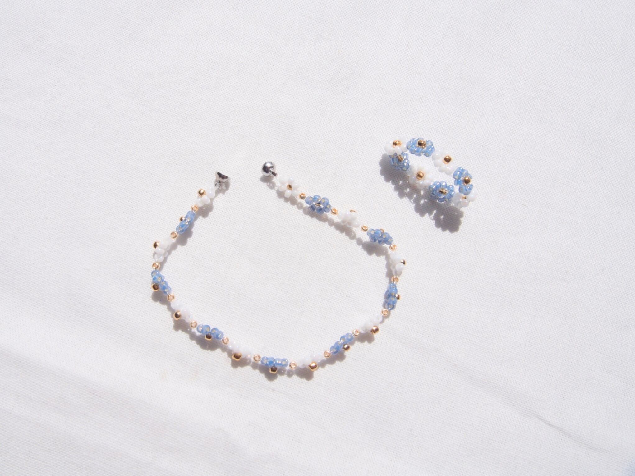 【セット】 ビーズブレスレット&リング 《 pearl blue 》 韓国