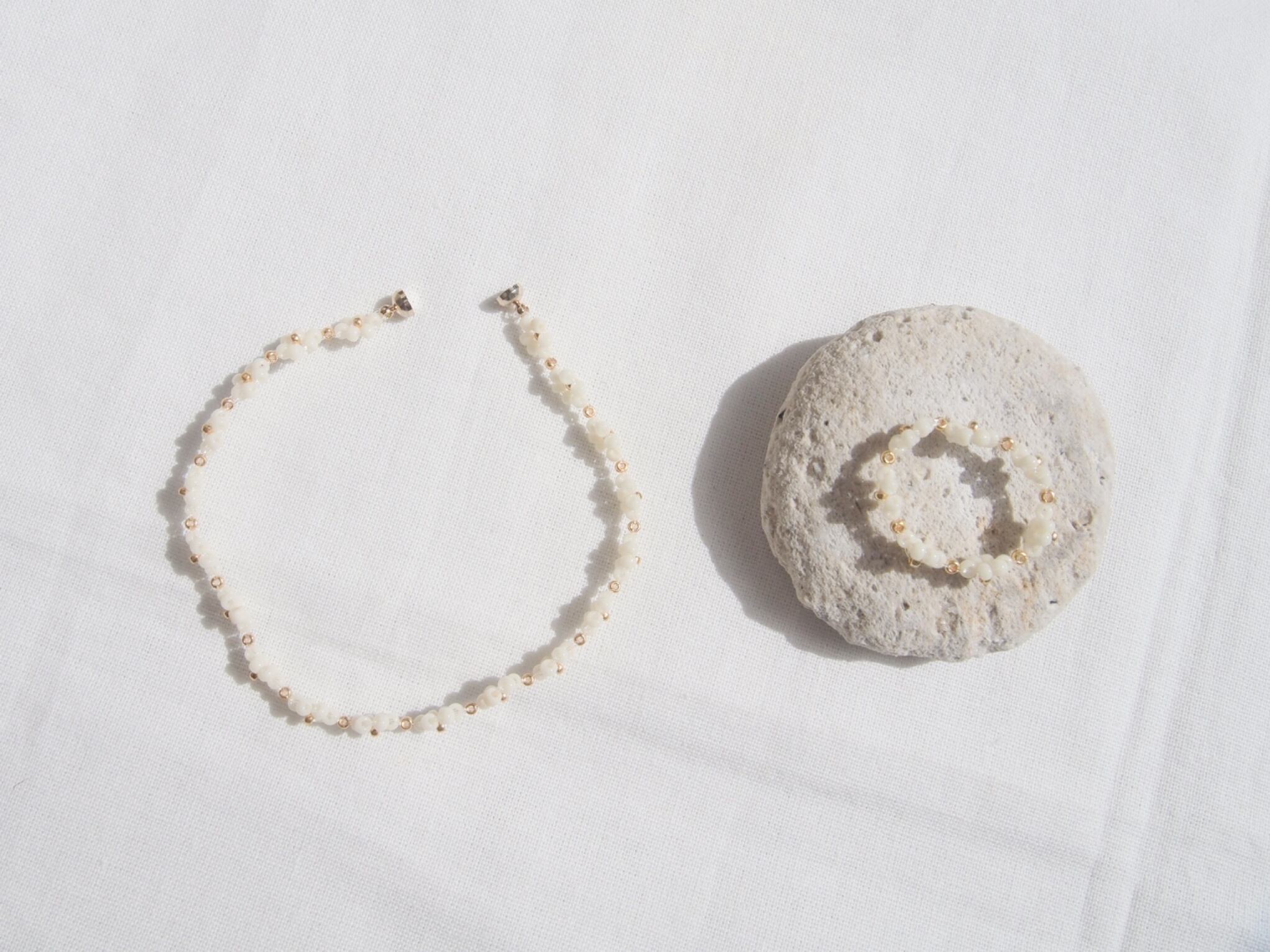 【セット】ビーズブレスレット&リング 《 white ・gold 》 韓国
