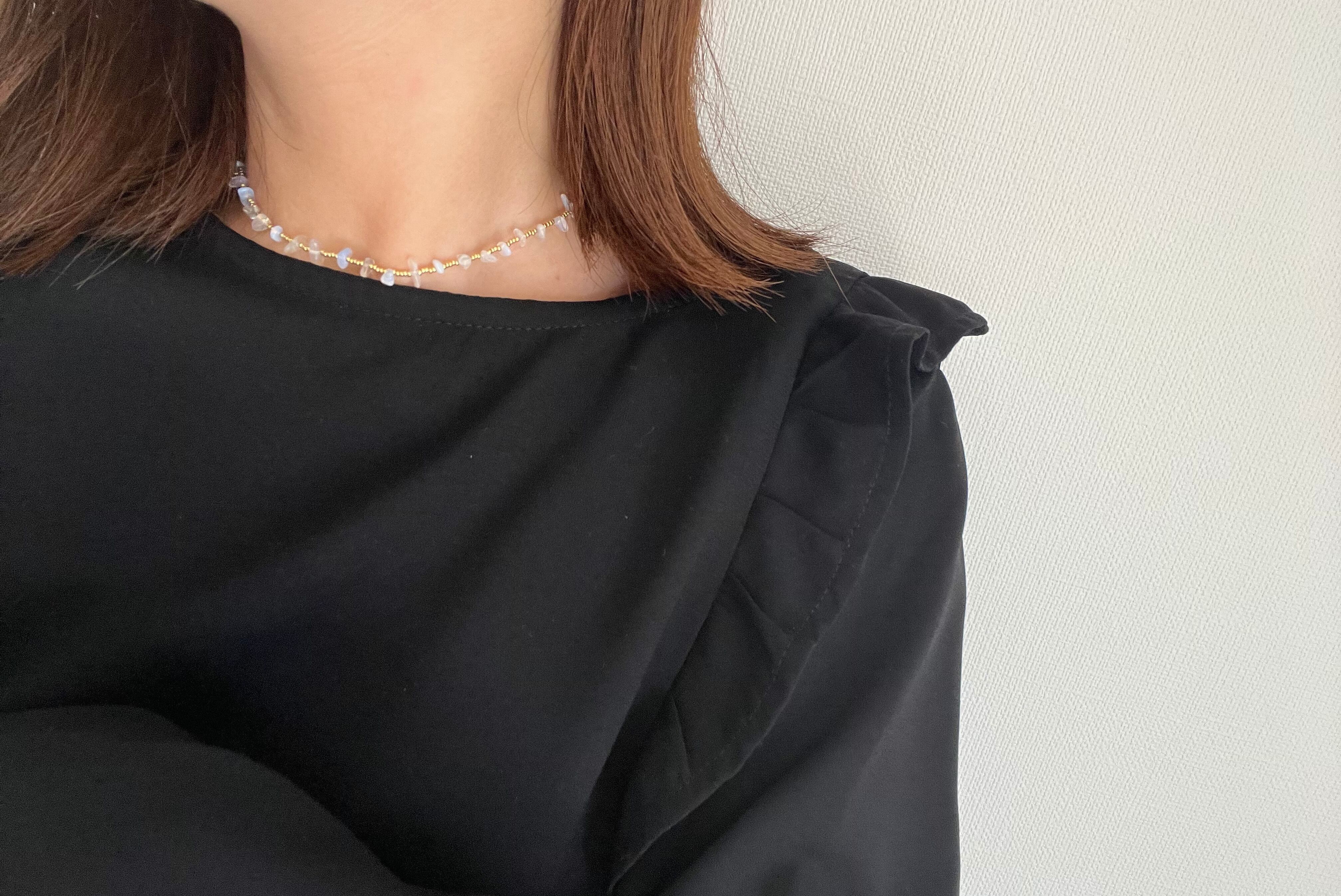 チョーカーの様な、短めのアクセサリーとなりますので、洋服に埋もれさせずに着用する事ができます。